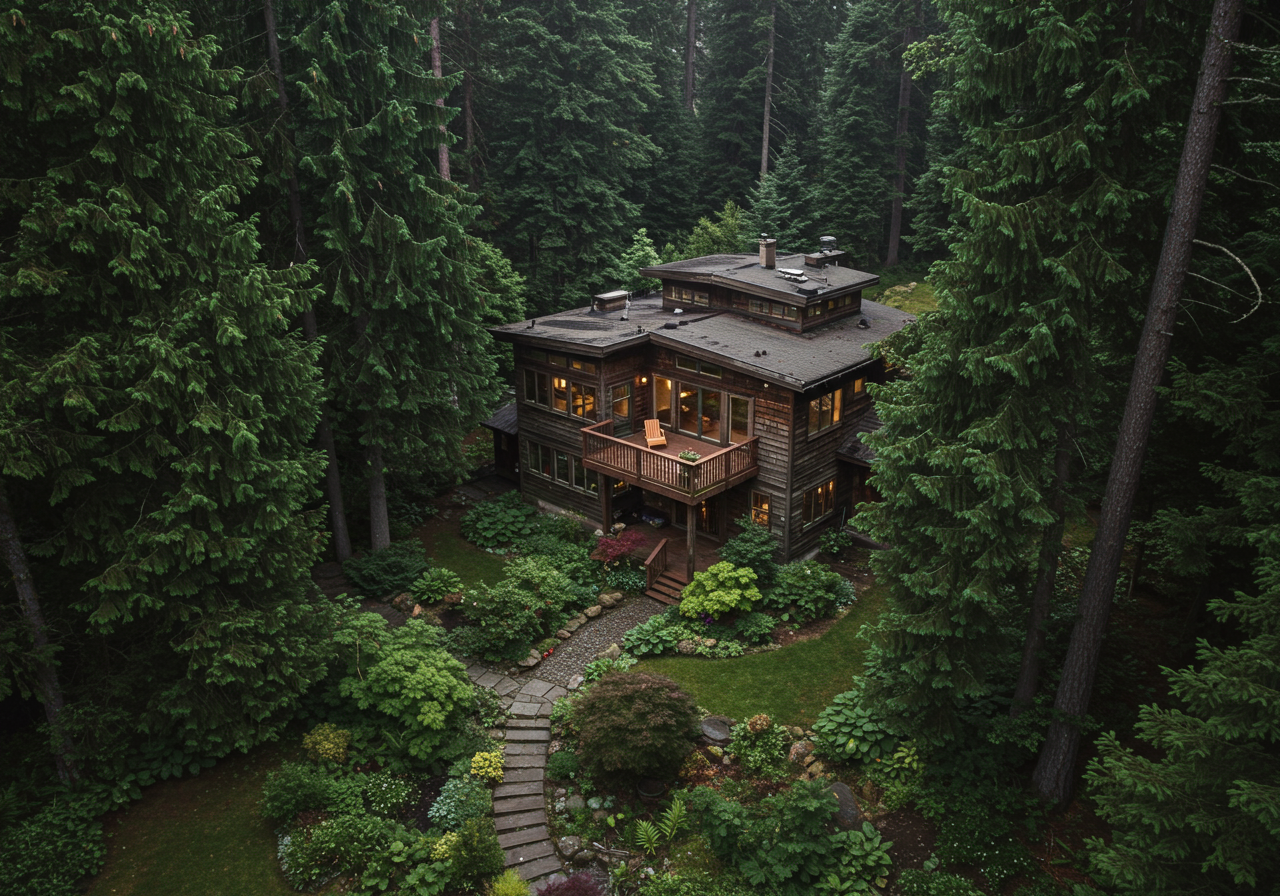 The two lots of the Northwood property, comprising about 6/10 of an acre, are a mature garden of trees, shrubs and perennial plants among majestic Douglas firs and big leaf maples. Deciduous trees provide seasonal flowers and autumn foliage color while large rhododendron and other broad leaf shrubs provide a backdrop of greenery year-round.