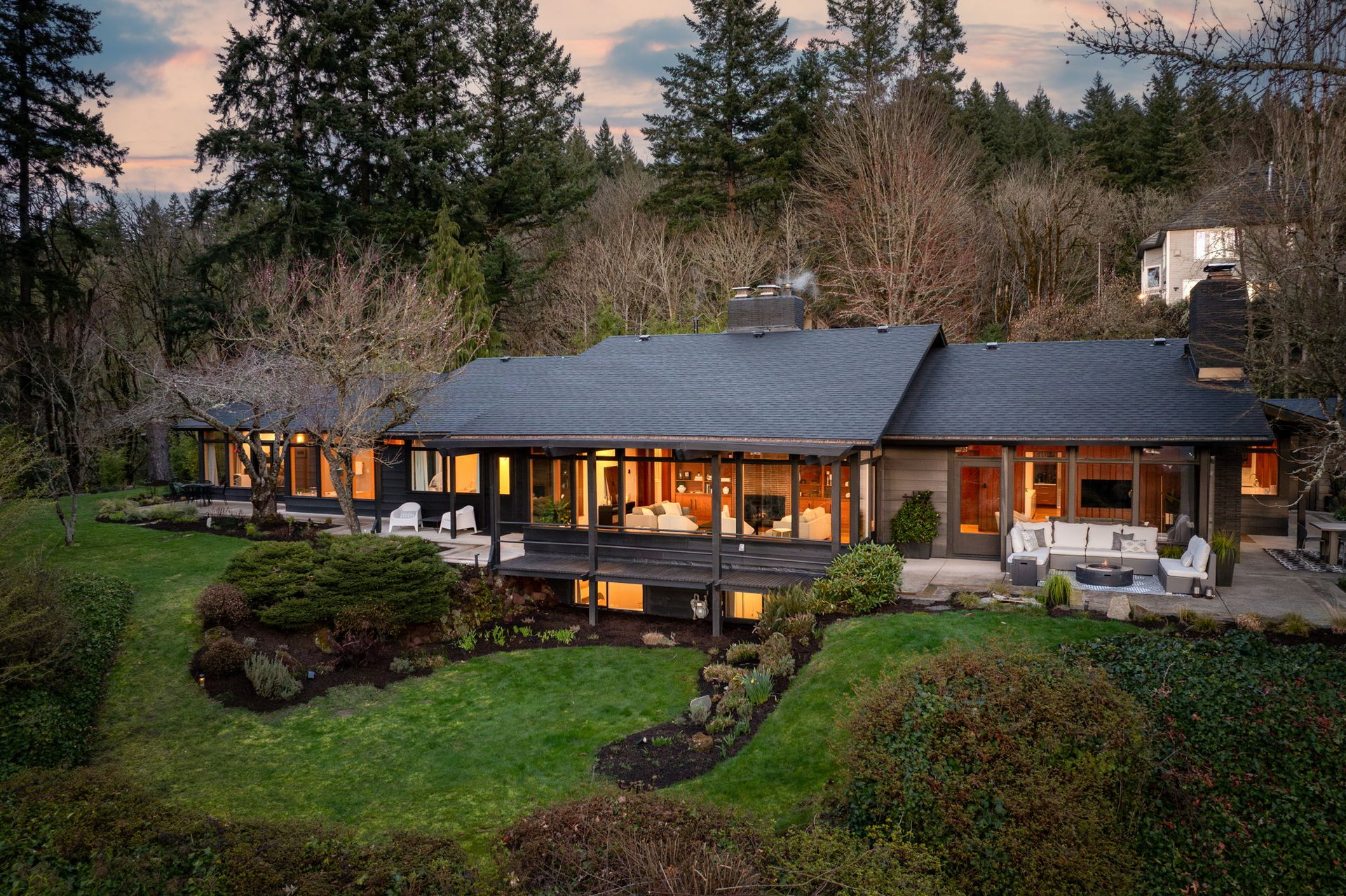 Outside, enjoy the spectacular sunset views from multiple patio areas surrounding the home made for lounging, dining, and fire side gatherings. The tranquil setting is complete with a Japanese style tea house, a large driveway with plenty of parking, and is beautifully landscaped around the house and forested beyond. The exterior also features high quality wood siding, concealed copper gutters, and beautiful vintage glass light fixtures.